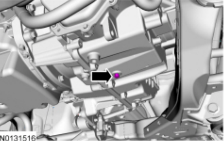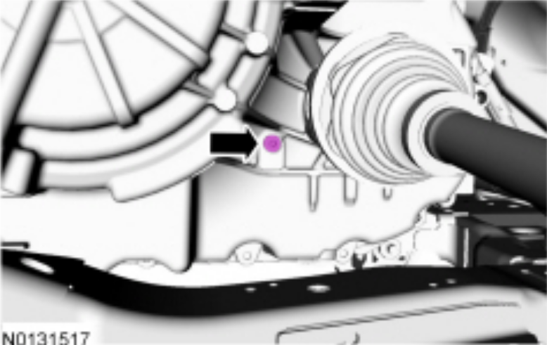 - With the engine still running and the vehicle still level left to right, place a catch pan under the left side of the transmission and remove the transmission fill plug, allowing fluid to drain until it’s even with the oil leveling plug hole. If fluid doesn’t drain when you remove the plug, add fluid in increments of 1/4 quart until it does. Reinstall the plug, and tighten to 8Nm (71 lb-in).