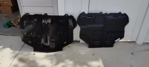 Upgraded engine splash shields with 3 access panels. Made of polypropylene (hard, rigid plastic–does not roll up, ships flat), approximately 3/16″ thick. Mounts without any modification using your existing hardware (3 screws across front, one near each wheel opening, and two at the rear of the subframe).
